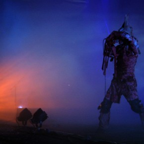 Und dann folgte eines der Projekte von Chris Pohl: „Blutengel“. Zwar wirkte die Darstellung von Sex-Spielchen reichlich plakativ, nichtsdestoweniger wurden damit gewiss erotische Phantasien (zumindest bei einigen Besuchern) angeregt oder auch befriedigt. Das Spektakel auf der Bühne bekam dann aber schnell Konkurrenz „höheren Ortes“ …am Himmel spielten sich dramatische Szenen ab. Eine pechschwarze schwefelgelb gesäumte Gewitterwolke legte sich greifbar nahe auf uns. Blitze um uns herum, unzählig. Krachende Donnerschläge mischten sich mit den Beats der Musik. Und so sah man reihenweise die Köpfe der Zuhörer zum „himmlischen“ Ereignis gedreht. Also ich weiß nicht… die Musik gefällt mir schon ganz gut. Trotzdem zog mich das Naturschauspiel absolut in seinen Bann. Leider war die Schwärze der Wolke nicht nur Dekoration, sondern eine massenhafte Ansammlung von Wasser. Welches sich dann auch über uns ergoss. Wir gehörten zu den Nicht-Schirmträgern, nutzten aber Nylonjacken (solch Quasi-Regenschutz). Das hätten wir uns sparen können. Als „Blutengel“ endeten waren wir bis auf die Haut nass. Also dann los und in aller Ruhe die Kleidung wechseln … ja, ihr vermutet richtig, als wir wieder trocken waren, hörte der Regen auf. Nur sich entfernendes Grollen und ein großer blassbunter Regenbogen bildeten die letzten Zeugnisse des Unwetters.