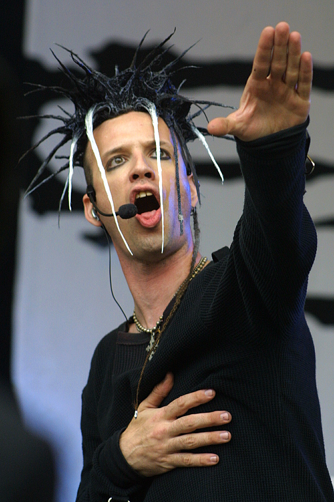 Stefan von „Das Ich“ nahm dämonisch rot geschminkt und wie immer in teuflisch anmutenden Verrenkungen die Bühne in Besitz. Kraftvoll und ausdrucksstark drängte sich seine Stimme in unsere Köpfe. Stefan nutzte den Auftritt für einen Appell an uns alle. Es waren drei Wünsche. Der Erste, dass die Rechten verschwänden. Neonazis brauche kein Mensch. Kann ich nur zustimmen. Wenn auch die Hintergründe und das „wem-nutzt-es“ ein weites Feld sind. Der zweite Wunsch bezog sich auf das Zillo, auf die 15 Jahre des Zillo, die Treue, und den wachsenden Mainstream. Ja, schon… aber wenn uns Musik gefällt, dann wollen wir sie auch hören. Zwangsläufig sind Produktion und Vermarktung von CDs letztendlich Kommerz. Und ohne die Bands, die man zum Mainstram zählt, wäre kein Festival realisierbar. Suchen und finden wir den Kompromiss – Zillo 2004 war eine sehr gute Mischung (meiner Meinung nach). Stefans dritter Wunsch war: „Auch die Tiere haben das Recht zu leben.“ Ja, man kann das für sich persönlich entscheiden. Um weltweit den Tieren das Recht zuzugestehen – da müsste die Menschheit sehr menschlich werden. Was nicht zu erwarten ist.