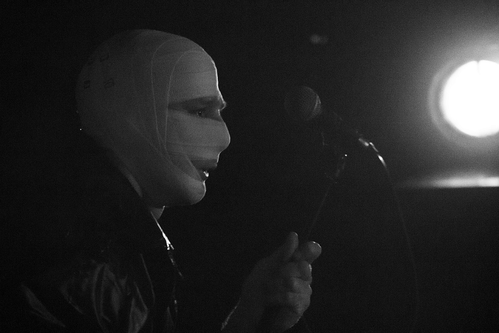 Nachdem alles für den Auftritt von „The Klinik“ bereit stand, vergingen endlose 30 Minuten, in denen eine Augenoperation auf die Hintergrundwand projiziert wurde (Bilder, die wohl nur wenige mit großer Begeisterung betrachteten), ehe endlich Dirk Ivens und Peter Mastbooms – traditionell in schwarze, lange Mäntel gekleidet und die Köpfe mit Mullbinden bandagiert – die Bühne betraten. Durch die Verhüllung wirkten die beiden Protagonisten alterslos. Als wäre seit dem ersten Auftritt von „The Klinik“ nicht über ein Vierteljahrhundert vergangen.