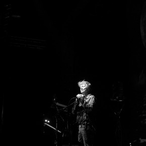 Bevor die Saalbeleuchtung ausging, überwog indes die Vorfreude auf ein mitreißendes Konzert. Trat Anne Clark vor einigen Monaten noch mit kompletter Band auf, präsentierte sich die Bühne diesmal deutlich spartanischer. Einzig zwei Podeste – auf einem stand die elektronische Ausstattung von herrB – und drei Mikrophone füllten die geräumige Bühne. Zurück zu den elektronischen Wurzeln? In gewisser Weise. Wobei Anne Clark in ihrer langen Karriere nach Ausflügen in den Bereich der „handgemachten“ Musik immer wieder zur elektronischen Klangerzeugnis zurückfand. Diesmal wurden die Stücke in ein relativ „modernes“ Gewand gehüllt. Die Skepsis, ob dies beim Publikum ankommen möge, zerstreute sich schnell, nachdem ein instrumentales Intro einsetzte, die Licht- und Videoshow von Lichtdesigner Rick Kay startete und die beiden Musiker als Schattenrisse auftauchten.