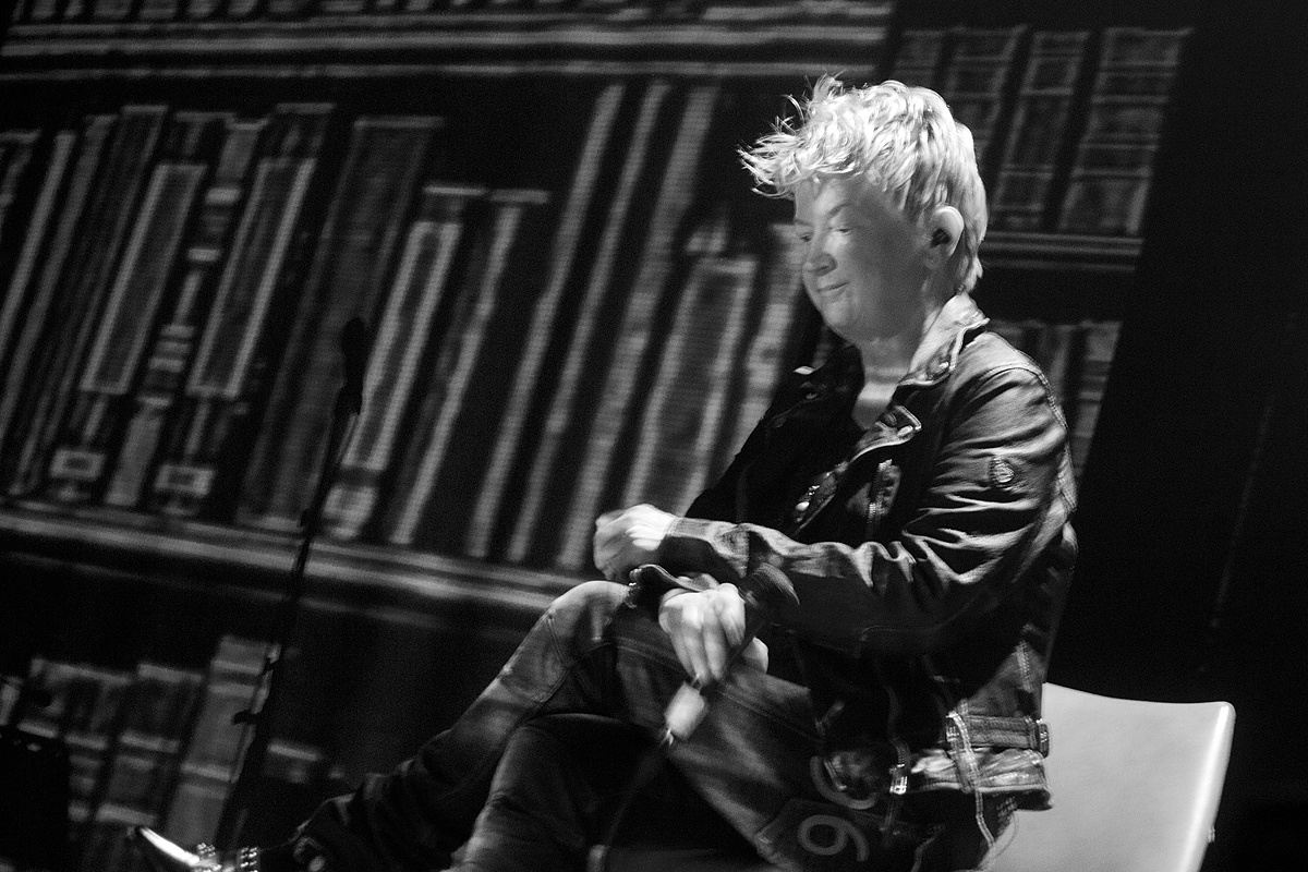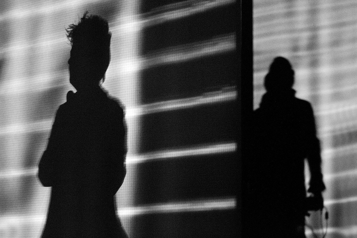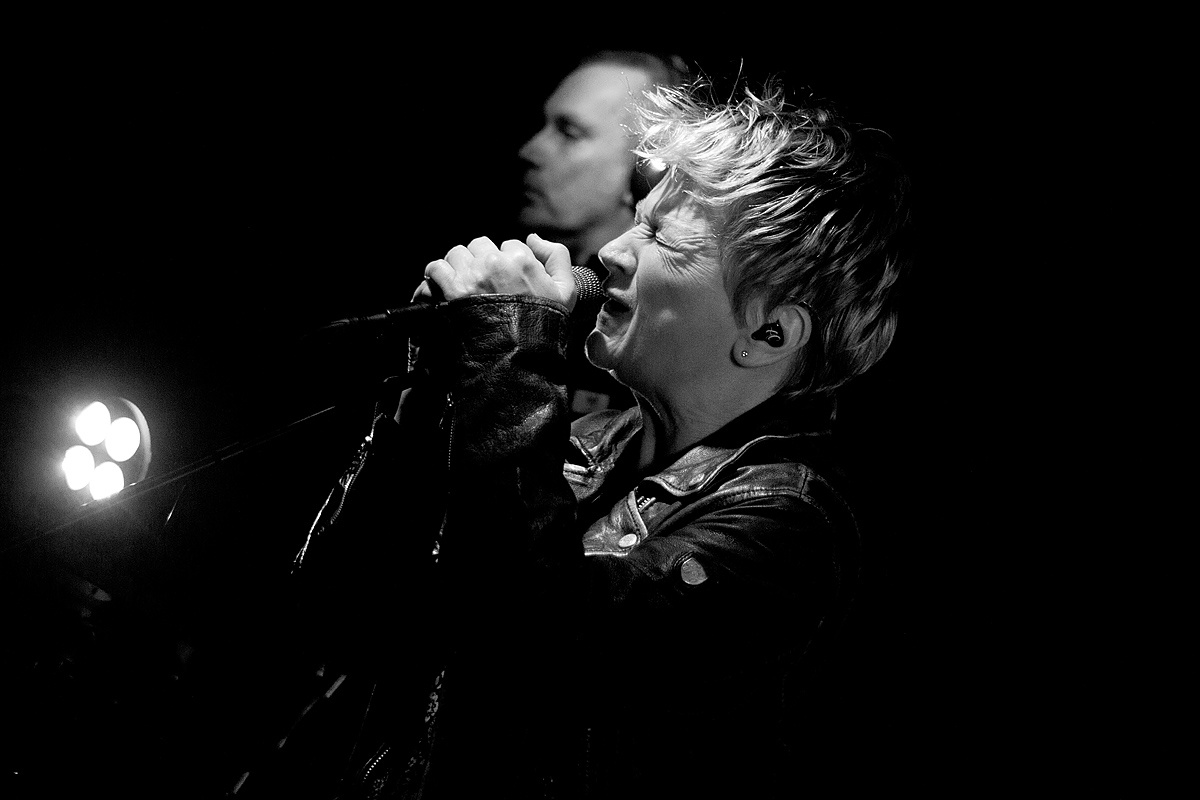 Bevor die Saalbeleuchtung ausging, überwog indes die Vorfreude auf ein mitreißendes Konzert. Trat Anne Clark vor einigen Monaten noch mit kompletter Band auf, präsentierte sich die Bühne diesmal deutlich spartanischer. Einzig zwei Podeste – auf einem stand die elektronische Ausstattung von herrB – und drei Mikrophone füllten die geräumige Bühne. Zurück zu den elektronischen Wurzeln? In gewisser Weise. Wobei Anne Clark in ihrer langen Karriere nach Ausflügen in den Bereich der „handgemachten“ Musik immer wieder zur elektronischen Klangerzeugnis zurückfand. Diesmal wurden die Stücke in ein relativ „modernes“ Gewand gehüllt. Die Skepsis, ob dies beim Publikum ankommen möge, zerstreute sich schnell, nachdem ein instrumentales Intro einsetzte, die Licht- und Videoshow von Lichtdesigner Rick Kay startete und die beiden Musiker als Schattenrisse auftauchten.