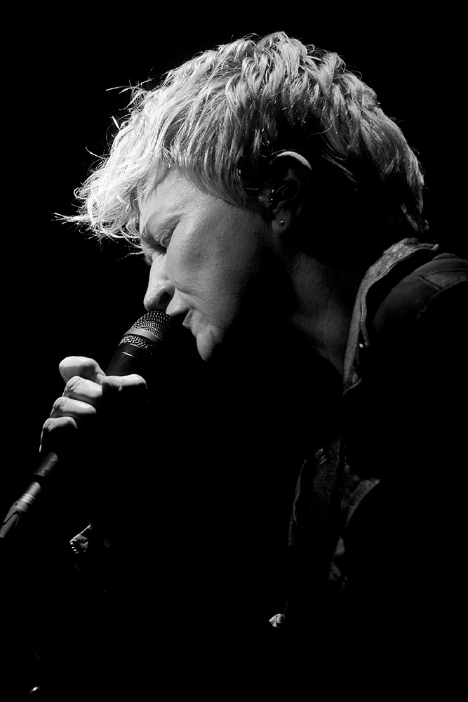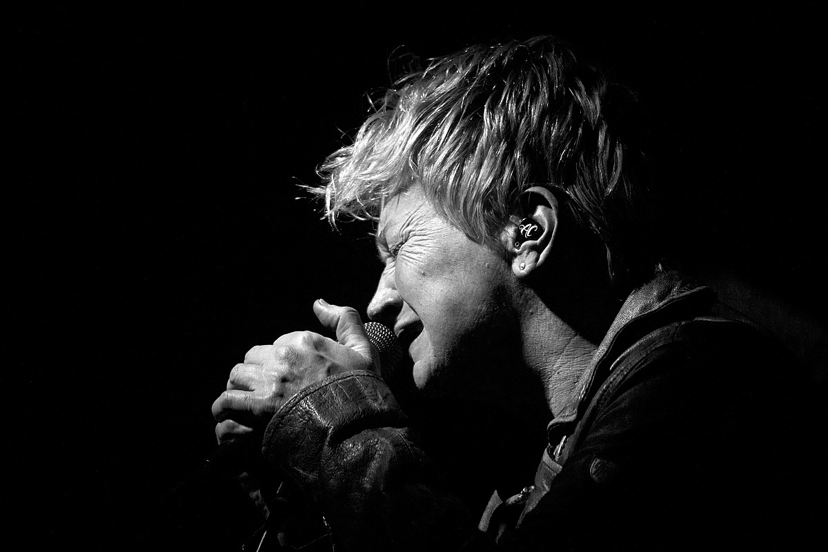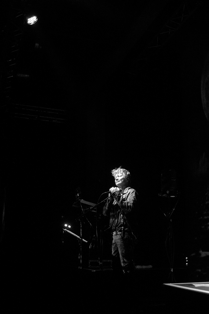 Und dann nahmen uns die klaren eindringlichen Worte von Anne Clark gefangen. Die „Grande Dame des New Wave“, die bereits in den frühen 80ern mit ihrem typischen Sprechgesang auftrat und für Aufmerksamkeit sorgte, wirkte konzentriert und in sich versammelt. Die kräftigen Rhythmen arbeiteten sich von den Füssen in die Beine empor und versetzten den Körper in Bewegung. Melodisch und abwechslungsreich wurden alte und neue Stücke präsentiert. Der kühl wirkende Gesang, die harmonische musikalische Begleitung, die Videoschnipsel und Lichteffekte bildeten eine perfekte Einheit.