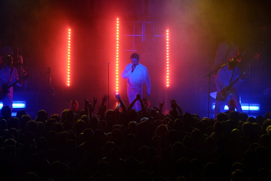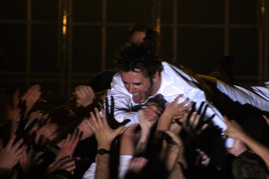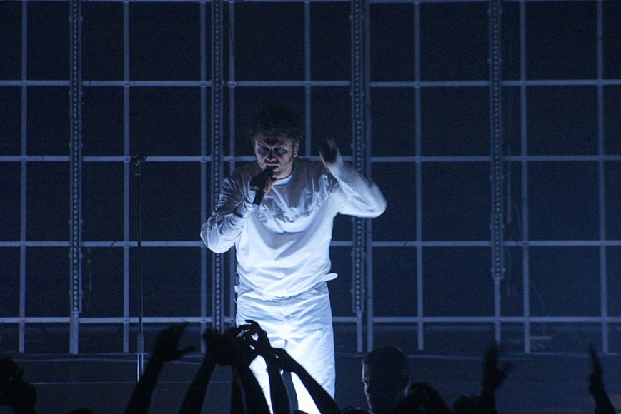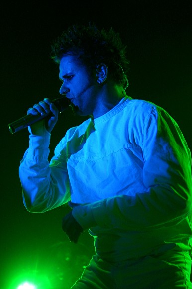 Nach einer kurzen Umbaupause war es dann endlich soweit: Das Hallenlicht erlosch. Die ersten Töne erklangen. An eine dreigeteilte Leinwand im Hintergrund wurden Porträts der Musiker von Oomph! projiziert. Dann kamen die drei Wolfsburger ganz in weiß gekleidet inklusive Verstärkung am Bass und den Drums auf die Bühne. Grenzenloser Jubel. Die Party konnte beginnen. Im Grunde kann man die oomphsche Leistung kaum in Worte fassen. Die Jungs machen nun schon seit 15 Jahren gemeinsam Musik. Und egal, ob sie vor 30 Zuschauern oder wie in diesem Fall in der Glauchauer Sachsenlandhalle vor schätzungsweise 1500 die Bühne betreten…sie spielen sich den sprichwörtlichen „Arsch“ ab und geben alles. Sänger Dero stand ohne Zweifel im Mittelgrund. Er sprang über die Bühne, „nahm ein Bad“ in der Menge, forderte zum rhythmischen Klatschen auf – ein Großteil der Fans kam dieser Forderung auch ohne Zögern nach. Dero hatte die „Meute“ sozusagen in der Hand. Eindringliche Blicke, Gestik, Mimik und Bewegung unterstützten die aussagekräftigen und tiefgründigen Texte.