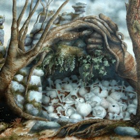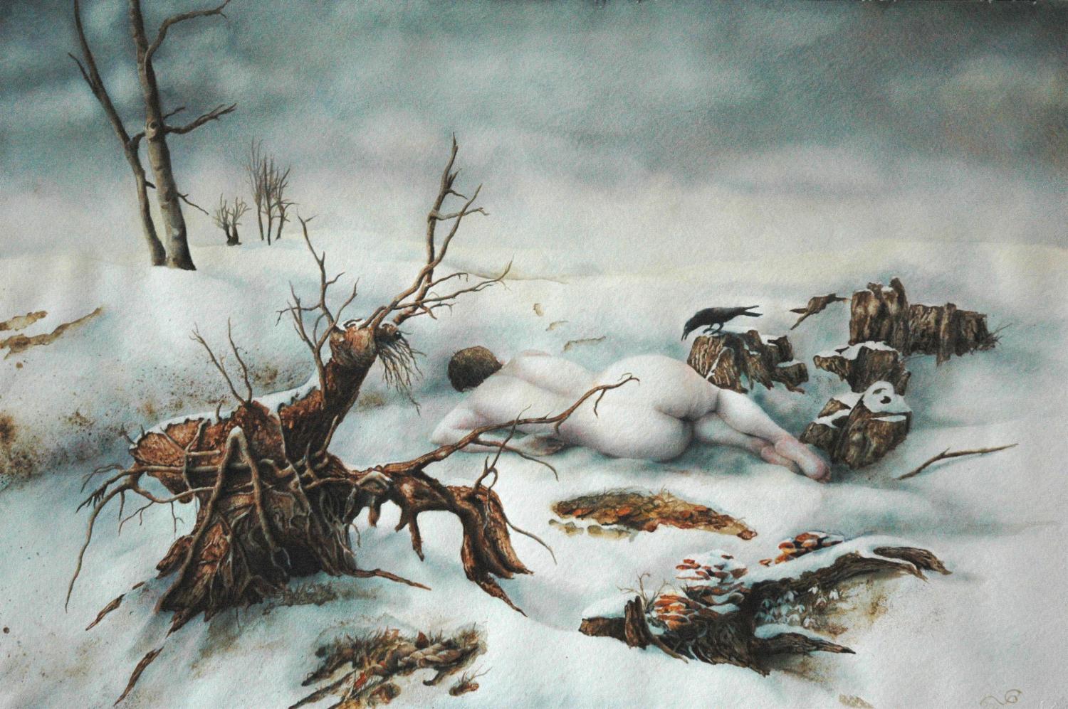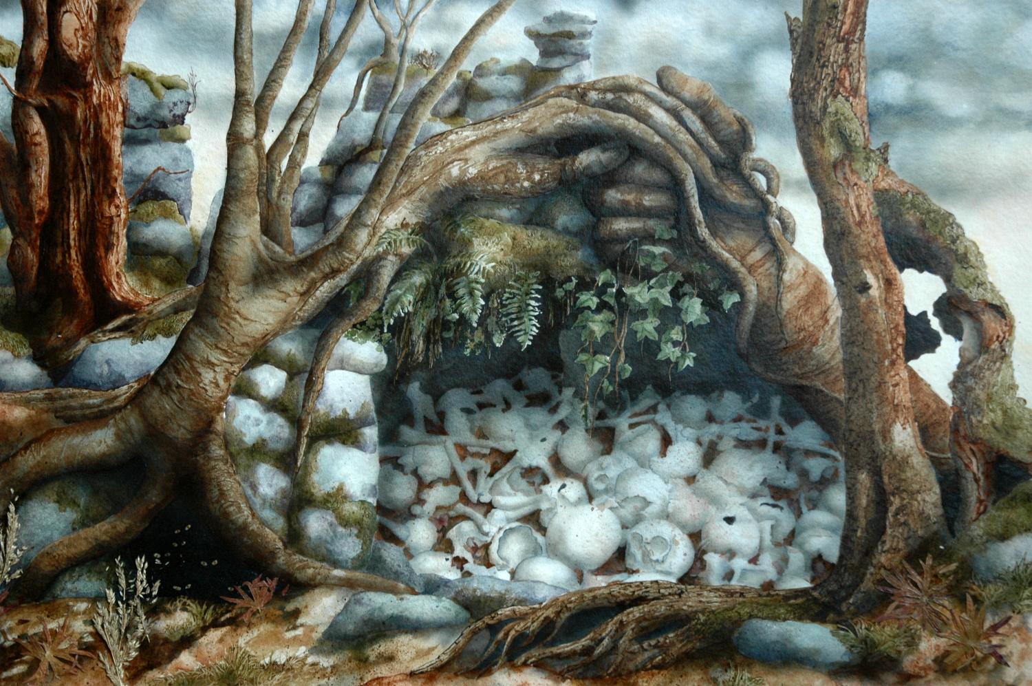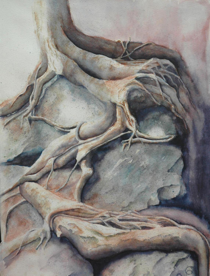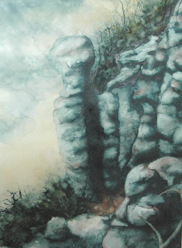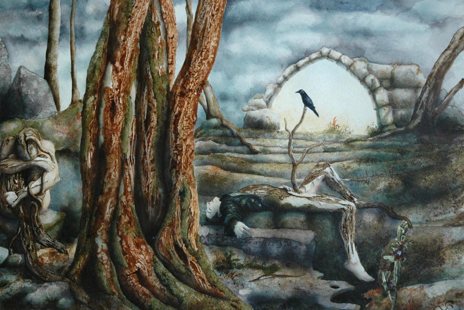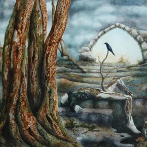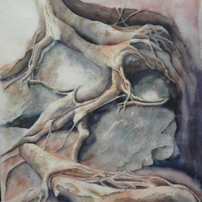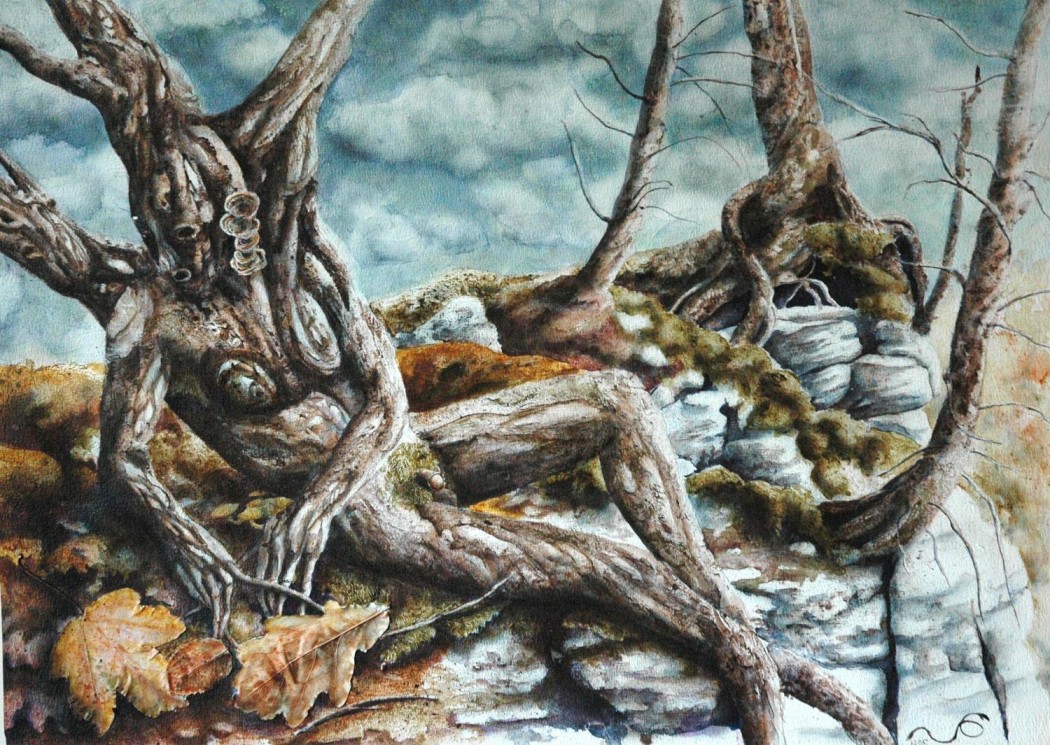 Aus der Metamorphosen-Serie stellen wir hier einige Bilder vor. Christines Phantasie formte aus bizarr geformten Bäumen „Waldwesen“. Tiere und Menschen verschmelzen mit Baum und Fels und erzählen dunkle Geschichten.