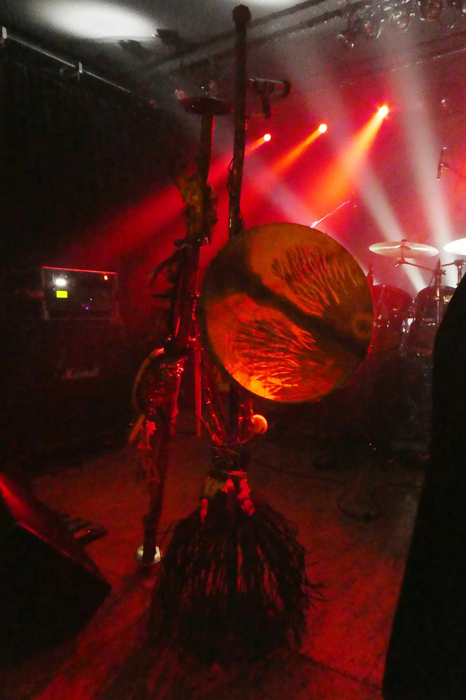 Als erste Band des Abends betrat Perchta die Bühne. Ebenfalls wie Dornenreich stammt diese Musikgruppe aus Tirol. Sie wurde 2017 um die mysteriöse Sängerin „Frau Perchta“ gegründet und veröffentlichte im April 2020 ihr Debütalbum namens „Ufång“. Dieses sorgte für einiges Aufsehen in der Presse und unter Verehrer*innen der urigen Musik härterer Gangart. Denn auf dem Debüt bietet die Band eine Mischung aus alpiner Folklore und rauen Black Metal. Die in Mundart verfassten Texte werden dabei von einer Sängerin vorgetragen, die sowohl clean als auch schreiend intonieren kann und das so, dass einen der eine oder andere Gänsehautmoment heimsucht. Textlich dreht sich alles um den Perchtenkult sowie die Natur. Und eben jenes Flair schaffte die Band in Jena auf die Bühne zu bringen. Der Mikrofonständer der Sängerin sieht aus wie ein Besen, an ihm ist eine bemalte Rahmentrommel befestigt. Daneben steht ein naturbelassener Holzstab mit Schellen und Schnitzereien. Am rechten Bühnenrand stand ein Hackbrett bereit. Nach dem atmosphärischen Intro enterte die Band die Bühne. Zwei Gitarristen, ein Schlagzeuger, ein Hackbrettspieler und dann die Sängerin. Jene war in ein schwarzes Trachtenkleid inklusive besticktem Gürtel und schwarzem Schleier gehüllt. Das Gesicht war mit Bemalungen verziert, die Augen durch Kontaktlinsen schwarz. Im Grunde genommen spielten Perchta das komplette Debütalbum. Als erstes rumpelte das brachiale Lied „Erdn“ durch den gut gefüllten Club. Dann folgte das folkige Stück „Långs“, bei dem die Sängerin mehr rezitiert als singt. Bevor es mit dem eingängigen und nicht weniger hartem Lied „Åtem“ härter und auch ein wenig eingängig weiterging. Ein großer Moment war der Titel „Wåssa“. Dieser geht circa neun Minuten und vereint alle stilistischen Elemente der Band. Vor allem gesanglich wurde hier gezeigt, wie genial klarer und schreiender Frauengesang miteinander harmonieren. Frau Perchta zog durch ihr Gebaren, ihr wütendes Holzstabstampfen, ihr versunkenes Trommelspiel und ihre Gänsehaut bescherende Stimme während des Auftrittes alle Anwesenden in den Bann. Und auch ihre Bandkollegen wussten ihre Energie auf der Bühne zu entfalten, sodass diese auf das Publikum überging. Dieses schenkte zwischen den Stücken und gerade am Ende des Auftritts reichlich Applaus.
