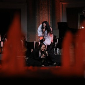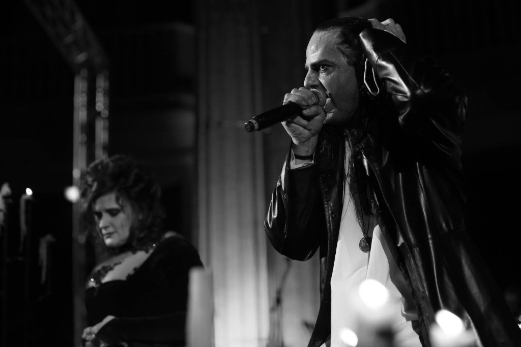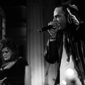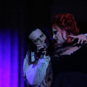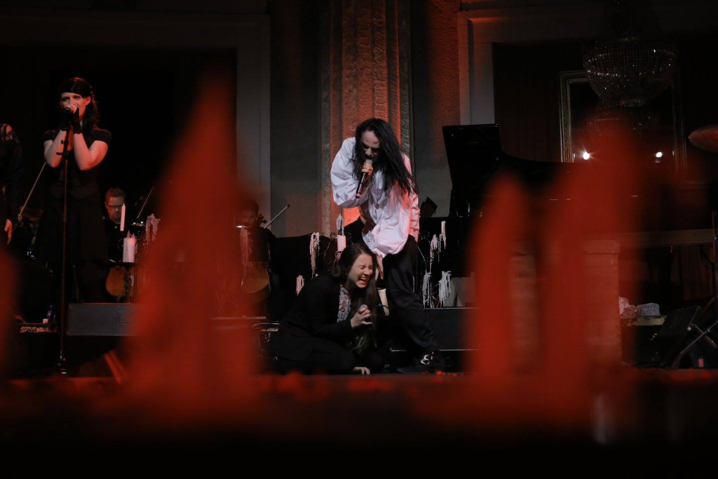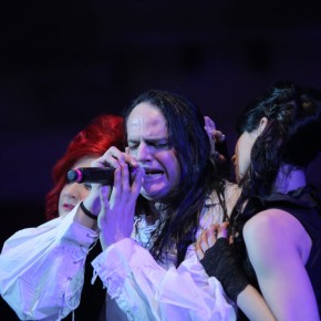 Ohne jetzt auf eine Reihenfolge einzugehen – auf der Bühne geschahen die wunderbarsten Dinge. Der dämonische Oswald Henke wurde von einer gleichgesinnten Schar Musiker begleitet. Tanzeinlagen passend zu den Stücken, die unterschiedlichste Stimmungen hervorriefen. Der erste Akt widmete sich der schwermütigen Romantik, wo hingegen der zweite Teil des Abends düster und abgründig war. Jeweils zehn Stücke erzählten unterschiedliche Geschichten und entführten so manchen Gast in die eigene Vergangenheit, als die musikalische Melancholie und die dunklen Gedanken von Goethes Erben entdeckt und lieben gelernt wurden.