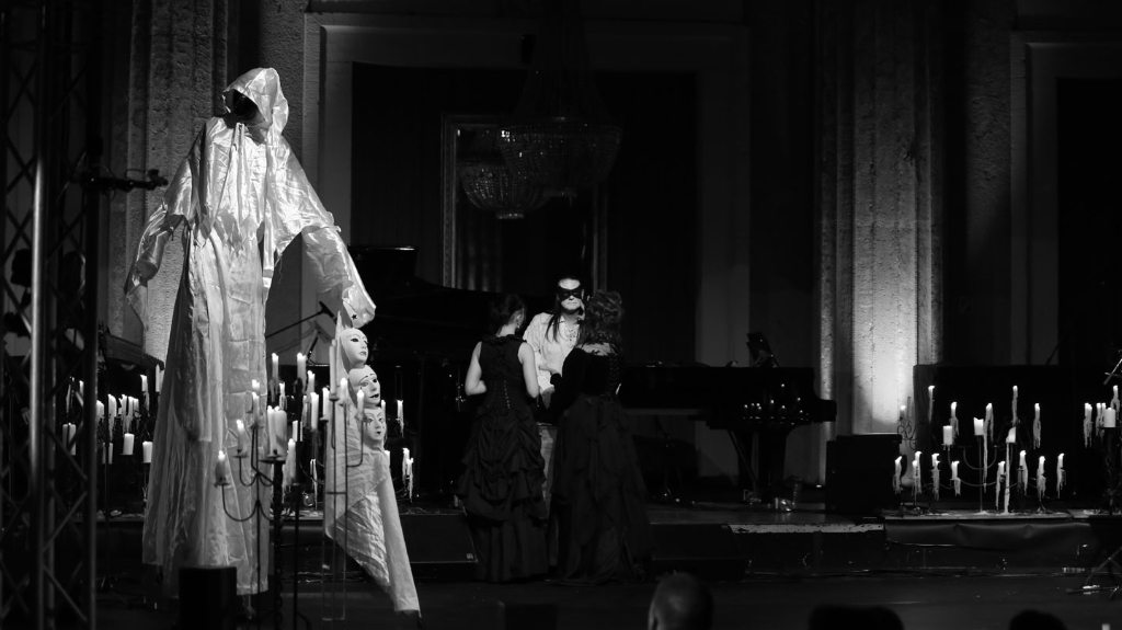 Töne wurden nicht nur auf gewöhnliche Art und Weise erzeugt. So öffnete sich bei einem Klavier wiederholt der Deckel, um die Saiten direkt anzuschlagen. Oder Instrumente, die keine waren – wie ein Kanister – wurden für rhythmische „Klopfzeichen“ der anderen Art verwendet. Da ließen die Streicher ihre Violinen und Celli einfach stehen und liegen. Dumpfes Trommeln von einem Schlagzeug. Hellere Geräusche von dem anderen. Streichbogen erzeugten am Rand eines Beckens oder eines Vibraphons unerwartete Geräusche. Einfach mitreißend. Die Augen folgen hin und her. Die Ohren versuchten, jeden kleinsten Ton aufzunehmen. Gesangliche Unterstützung gab unter anderem Sonja Kraushofer (Persephone, L’âme Immortelle) – stimmgewaltig, voluminös. Variabel dazu die Stimme von Lisa Morgenstern, die neben ihrem Klavierspiel auch tänzerisch eines ihrer Talente zeigte. Ein weißwallendes Gewand umhüllte eine Gestalt auf Stelzen, die gespenstisch durchs Publikum und auf der Bühne stakste. Oswald zauberte immer neue Erinnerungsstücke aus seiner Truhe. Erzählte dazu. Kreischte und flüsterte. Bedrückend die Szenerie bei der Suche nach Iphigenie… Oswald Henke ist ein Komödiant, der in der Dramaturgie seiner Texte vollkommen aufgeht. Leid und Trauer und Wut – authentische Gefühle in geballter Ladung. Auch als Zuschauer, oder besser: als Mit-Erleber wurde man in diesen Taumel widerstreitender Gefühle hineingezogen. Inklusive einem wohligen Schauer, der sich den Weg über den eigenen Rücken bahnte. Als sich ein Bündel Mensch in Zwangsjacke mit lose hängenden Ärmeln auf und neben der Bühne wälzte, unartikuliert schrie – erbarmungslos verfolgt von endlosem tückisch-bösartigem „Sehr gefährlich!“ bedrängt… Henke wie im Rausch… „Sehr gefährlich! Sehr gefährlich!“… in immer anders klingender Betonung. Bedrohlich und faszinierend zugleich.