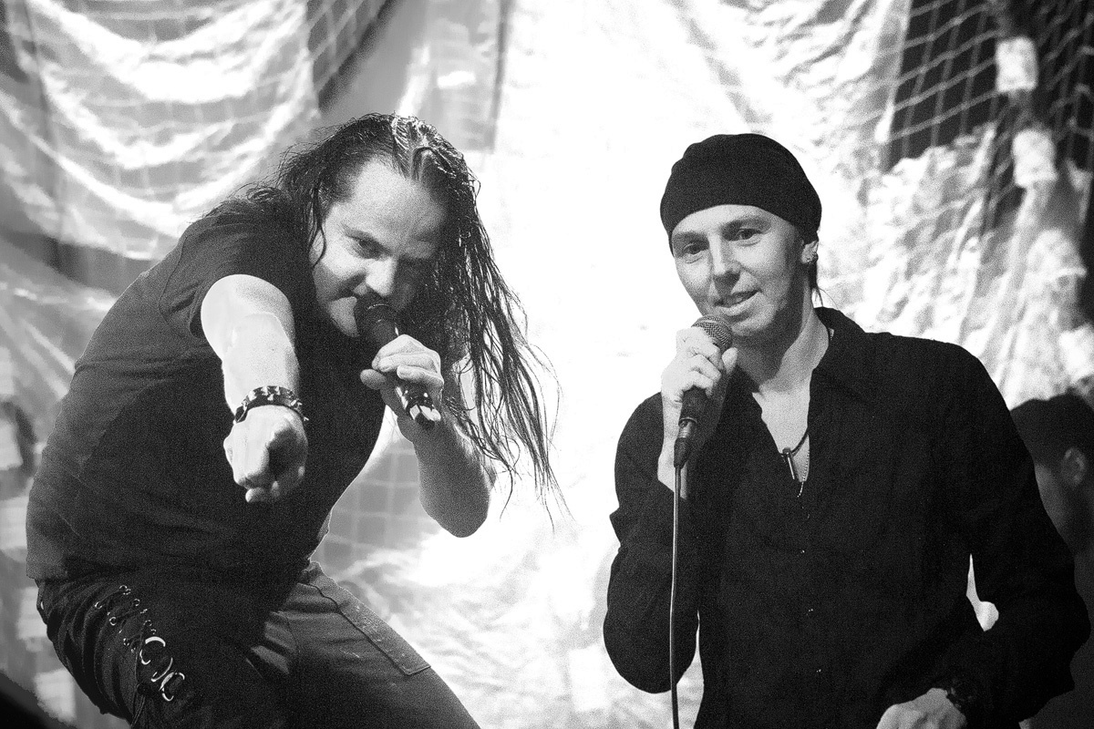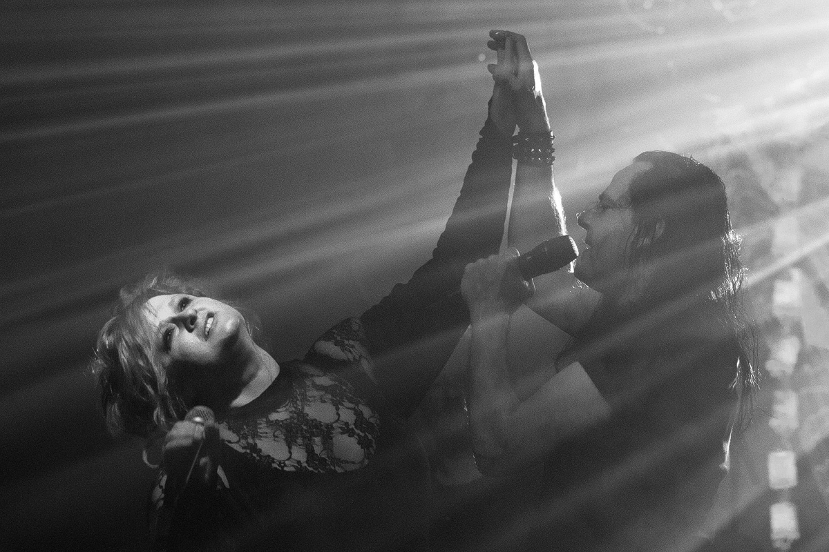 Ein wahrlich ungewöhnlicher Konzertauftakt. Ruhig und zurückhaltend. Doch voller Nachdenklichkeit. Und auch der zweite Titel „Traumsuche“ zeigten „Goethes Erben“ von ihrer stilleren Seite. Sanftes Cellospiel begleitete das Duett von Oswald Henke und Sonja Kraushofer, die auch im weiteren Verlauf des Abends durch ihre Stimmgewalt und ihre theatralische Körpersprache brillierte. Aufregend ihre wie wahnsinnig wirkende Mimik. Eine starke Frau mit einer Ausstrahlung, die den Zuhörer bzw. Zuschauer in den Bann zog und deren Stärke im Zusammenspiel mit Oswald Henke unbedingt nötig ist.