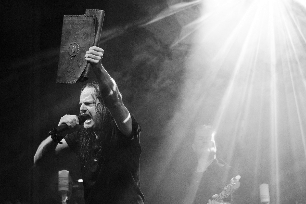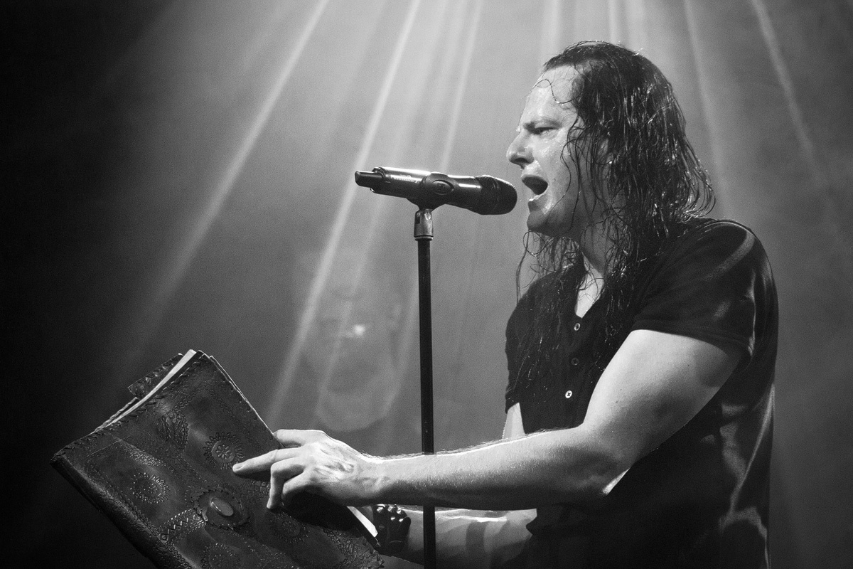 „Goethes Erben“ präsentierten ein Feuerwerk aus alten bekannten Liedern und einigen neueren Titeln aus dem Musiktheaterstück „Menschenstille“. Für ein Duett kam Sara Noxx zurück auf die Bühne: „Sie wusste mehr“ – ein perfektes Zusammenspiel. Und Oswald Henke forderte zum Tanz. Ein Schmunzeln konnten sich die Wenigsten verkneifen. Apropos Schmunzeln: Wenn er und Sonja Iphigenie suchen und Cornelius Sturm (Bass) kurzerhand zum Metzger ernannt wird, huschte ein sarkastisches Grinsen über sein Gesicht. Ob es das fast verschmitzte Parieren des Aufschreis aus dem Publikum, als er seinen Pferdeschwanz löste, oder seine sich mehrmals auf der Flucht befindliche Hose war, die ihn zu Scherzen animierte: An jenem Abend offenbarte er mehrmals seinen Hang zum Humorigen. Diese lockere Stimmung verflog jedoch bei den dargebotenen Stücken, welche er sichtbar „durchlebte“ und neu interpretierte. Echte Emotionen, die zudem visualisiert wurden. Papierblätter dienten als Speise oder wurden zerknüllt und auf den Boden geworfen. Aus einer Truhe bzw. einem Koffer förderte Henke Erinnerungsstücke zutage. Accessoires als Auftakt für das nächste Lied.