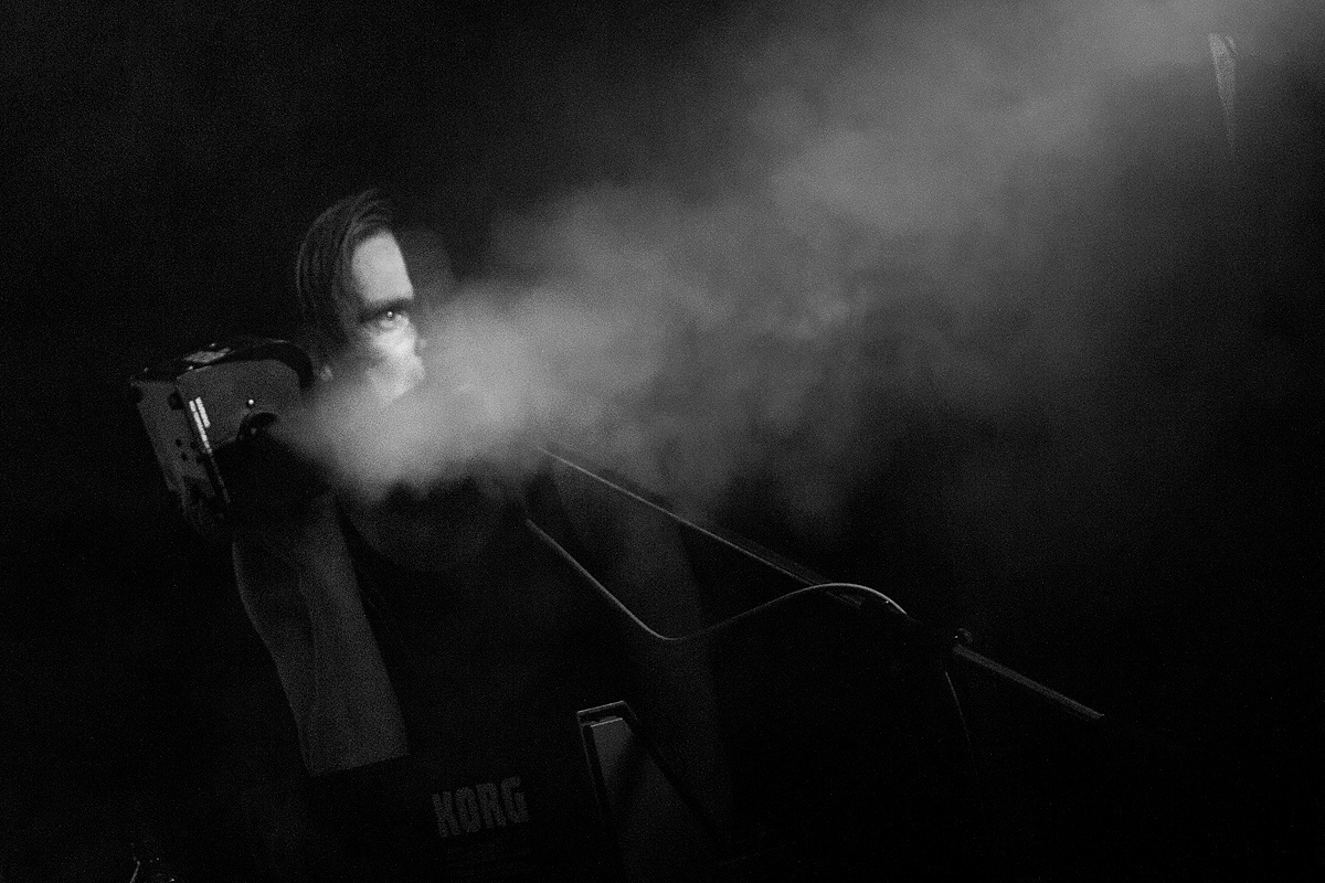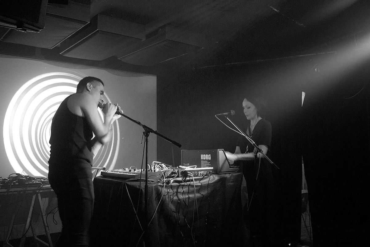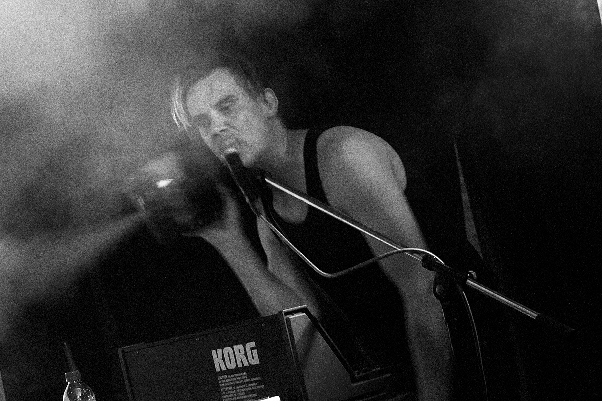 Die Umbaupause bewegte sich in einem überschaubaren Rahmen und wurde mit sehr angenehmen Klängen aus der Konserve kurzweilig überbrückt, ehe das Duo „Lola Kumtus“ aus Finnland ins Rampenlicht trat. Das Duo – deren Pseudonyme an die Geschlechtsdetermination durch Chromosomen angelehnt sind – verschwendete keine Zeit und riss das Publikum schnell mit. Obwohl „XX“ mit entzückender Weiblichkeit die Blicke auf sich zog, stand Sänger „XY“ im Mittelpunkt. Mehrmals griff er sich die frei stehende Nebelmaschine, um seine Partnerin und die Klangerzeuger tatkräftig per Knopfdruck hinter einem Schleier kurzzeitig verschwinden zu lassen. Jedoch brillierte der junge Herr nicht nur mit unbändigem Temperament, sondern ebenso mit einer klaren kräftigen Stimme. Dazu gesellten sich packende, synthetische, stellenweise experimentelle Klänge, die in Füße und Beine fuhren. So bedankten sich die Anwesenden mit kräftigem Beifall. Via Facebook bat der Sänger später für einen „Mangel an Intensität“ um Entschuldigung. Schuld sei Fieber gewesen. Wir haben den Auftritt durchaus als intensiv wahrgenommen und sind nun sehr neugierig, wie sich sein Temperament noch steigern lässt. Die nächste Möglichkeit, ein Lola-Kumtus-Konzert zu besuchen, werden wir sicherlich nutzen.