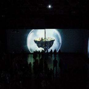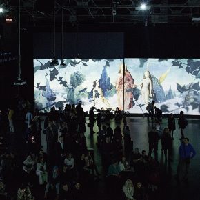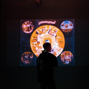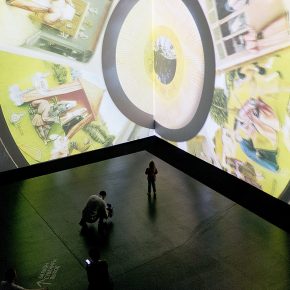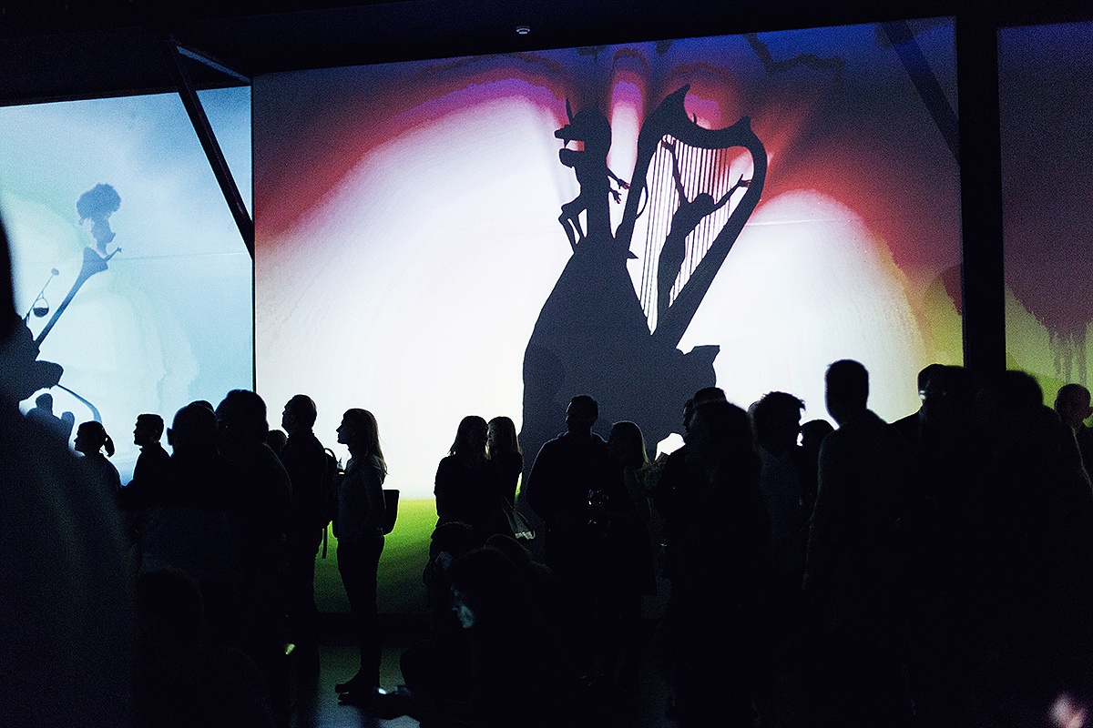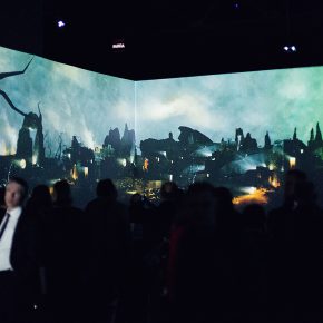 Endlich löst sich die Blockade und wir nähern uns vorsichtig dem nächsten Raum. Unsere Kinnladen geben der Schwerkraft nach. Ein großer Raum mit diversen Sitzgelegenheiten: einige Stühle und Bänke laden zum Verweilen ein. Und: Sitzsäcke. Oder besser: Liegesäcke. Eine Einladung, die wir nicht ausschlagen können. Nachdem wir uns niedergelassen haben, verlieren wir uns vollständig. Über die langen Projektionswände tanzen die Bilder, um dann neuen Einzelheiten Platz zu machen. Nun nehmen wir auch die teils sphärische, träumerische und kirchliche Musik wahr. Die gemalten Halluzinationen und deren perfekte klangliche Untermalung lassen uns gewissermaßen entrücken und der realen Welt abhandenkommen. Etwa eine halbe Stunde währt ein „Durchgang“, ehe die gewaltigen Bildwelten von neuem starten. Trotz Wiederholung können wir uns nicht lösen.