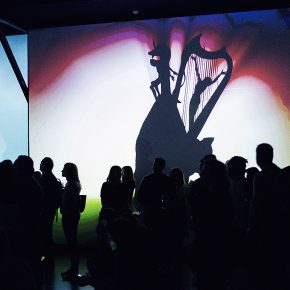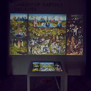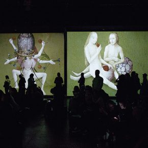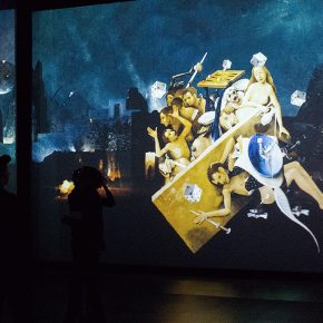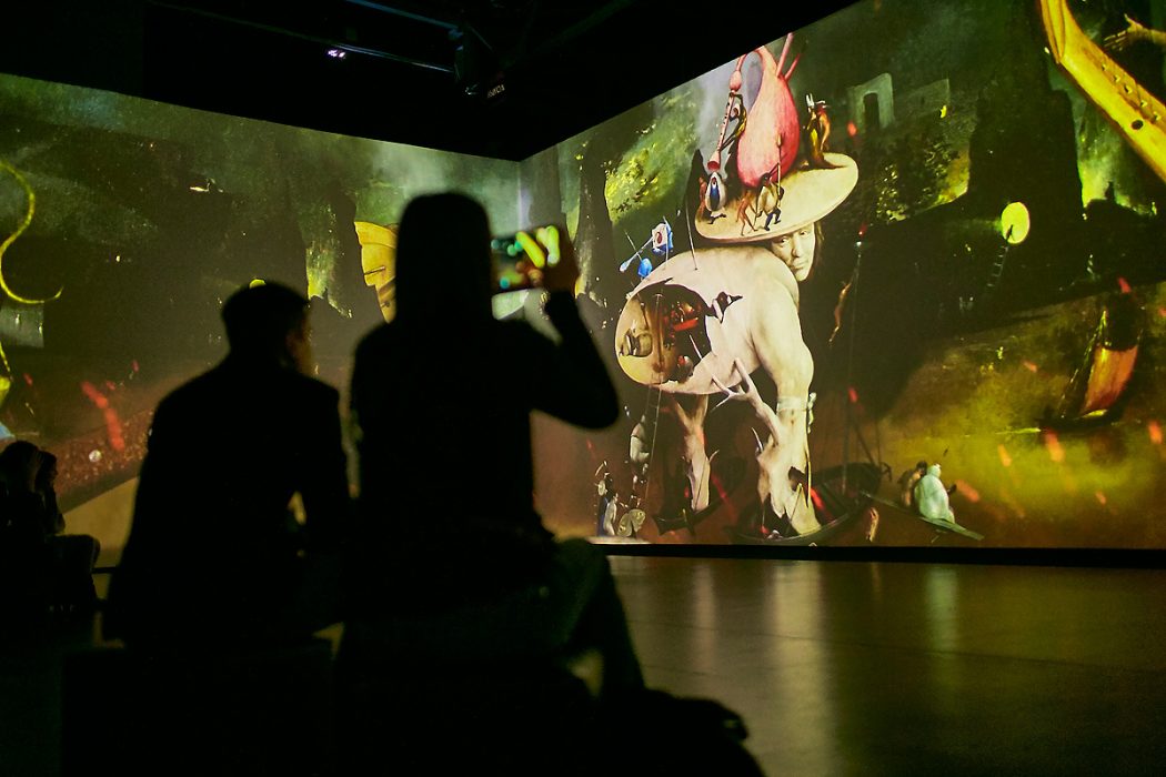 Im nächsten kleinen Raum warten rundherum Projektionen von Gemäldedetails auf uns. So hat man das noch nie gesehen! Die Gemälde an sich bestehen aus so unzähligen Details, dass man sich kaum darauf konzentrieren und einlassen kann. Hier schweben sie groß in leuchtender Farbigkeit. Gebannt – nicht nur mit den Augen, auch die Füße scheinen festgeklebt am Boden – steht man in dieser Rundum-Installation. Ungeheuer, die Konglomerate aus vielen Dingen sind. Mischwesen. Albtraumhafte Kreaturen. Wilde Tiere und Menschen, die wie Schemen wirken. Verwachsene Musikinstrumente. Es bewegen sich Vögel, etwas hüpft, Blätter regnen… etwa eine halbe Stunde stehen wir wie erstarrt und können uns nicht aus der Faszination lösen. Schwebende Bilder, immer in Bewegung. Die begleitende Musik nehmen wir zu diesem Zeitpunkt nur als Randnotiz wahr.