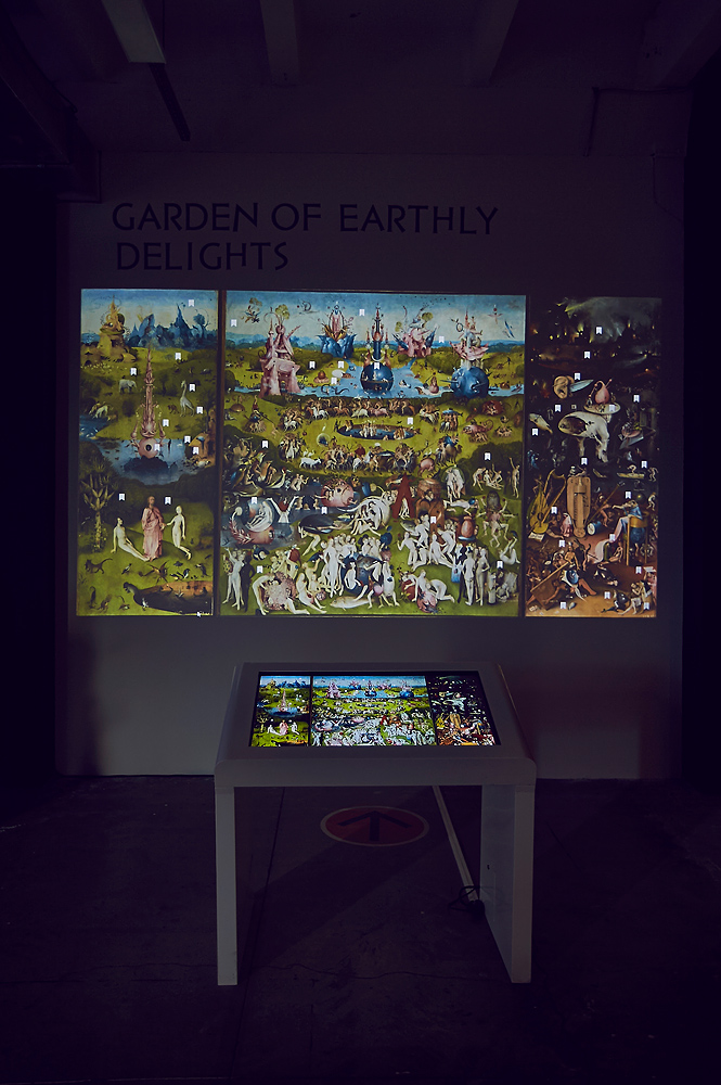 Der Weg führt durch schwarze, blick- und lichtdichte Vorhänge in einen Vorraum. Dieser ist rundherum mit informativen Schrifttafeln bzw. Monitoren versehen. Eine Galerie mit Portraits oder Symbolen aus der Lebenszeit von Hieronymus Bosch geben einen guten Einblick in die Zeit der Renaissance. Zwei multimediale Stationen sind dicht umlagert. Hier lassen sich Gemäldedetails inklusive Deutungsversuche aufrufen. Doch unsere Neugier ist zu groß (hatte doch ein gewisser Herr Christian von Aster – seines Zeichens ein großartiger Wortakrobat – in höchsten Tönen dieses Ereignis gelobt) und so sollte die „Theorie“ warten.