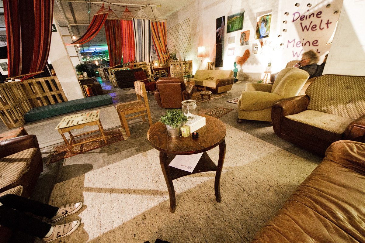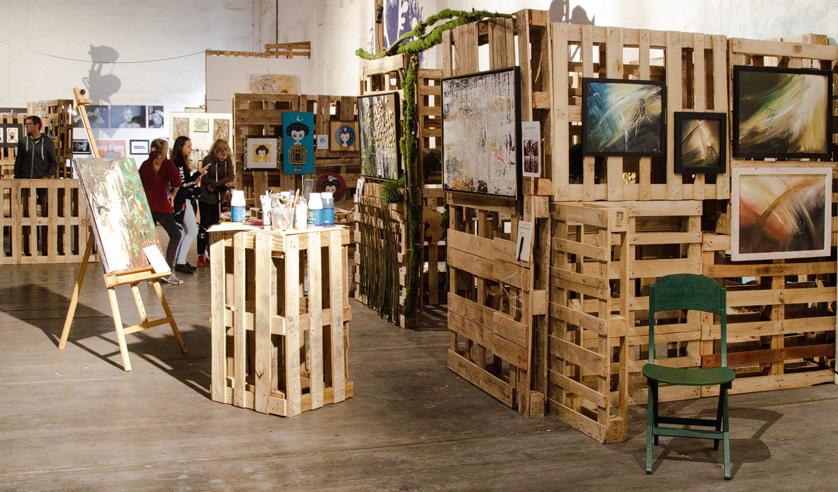 Mit einem abwechslungsreichen Angebot – Fotografie, Malerei, Kunsthandwerk, Holzschnitzereien, Installationen, Tanz und und und – haben es die Veranstalter geschafft, unterschiedlichste Menschen anzusprechen, die neugierig die beiden Hallen durchstreiften. Oder sich im urgemütlichen „Gesellschaftsraum“ in eines der alten Sofas oder einen Sessel niederließen. Ebenso fand die sich daneben befindliche „Palettenlounge“ Gefallen. Einwegpaletten zogen sich wie ein roter Faden durch die Gestaltung und waren in vielfältiger Verwendung überall anzutreffen: als Sitzgelegenheit, Tisch, Absperrung, oder auch als „Wand“ für die Kunstobjekte.