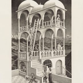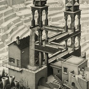 „Escher bekannte 1965 in seiner Rede anlässlich der Verleihung des Hilversumer Kulturpreises: ‚Ich kann es nicht lassen, ich muss mich einfach über all unsere unerschütterlichen Überzeugungen lustig machen. Es ist zum Beispiel ein großer Spaß, die Zwei- und die Dreidimensionalität, das Flache und das Räumliche miteinander zu vermischen oder mit der Schwerkraft Schabernack zu treiben.‘“