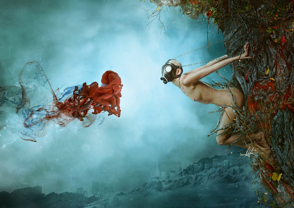 Weniger rätselhaft „Betrayal“ (Verrat): Eine Schusswaffe aus düsteren Wolkenkratzern ist auf die Schönheit der Natur gerichtet. Offene Kritik an der Zerstörung der Umwelt durch den Menschen.