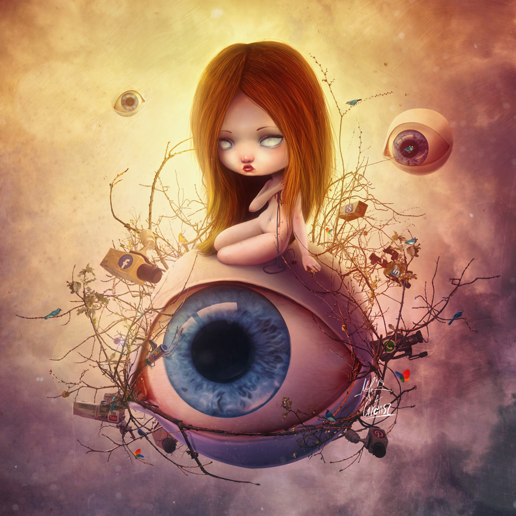 Auf einem naiv wirkenden, kugelförmigen Auge hockt ein stilisiertes Kind. Umgeben von Kameras mit verschiedenen Logos – Facebook ist zu erkennen, ebenso wie Youtube, Google, Ebay und weiteren Datensammlern – wirkt es mit seinen glasigen Augen irgendwie freudlos. Unwirklich. „Big Brother“ is watching you!