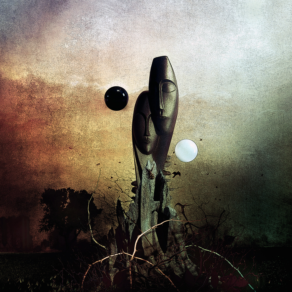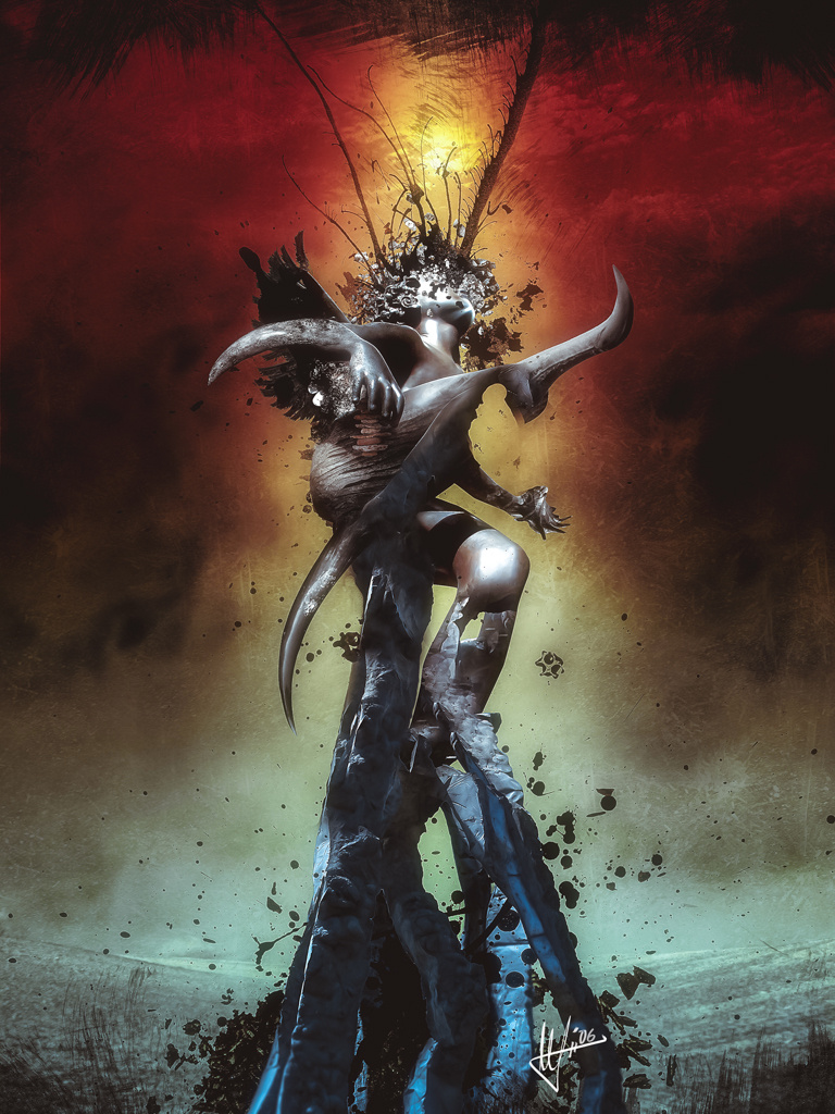 Fragen wirft ebenso das Bild „Postlife“ auf. Eingerahmt von zwei Planeten (Sonne und Mond?) befinden sich im Mittelpunkt dieses Werks zwei blockige Wesen aus Metall. Ein Mahnmal? Ein Blick in die Zukunft? Das Leben nach dem Tod? Gliedmaßen strecken sich aus einem Feld einer grazilen, vierarmigen Vogelscheuche („Scarecrow“) entgegen. Wen oder was möchte sie vertreiben?