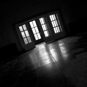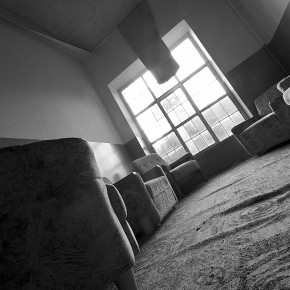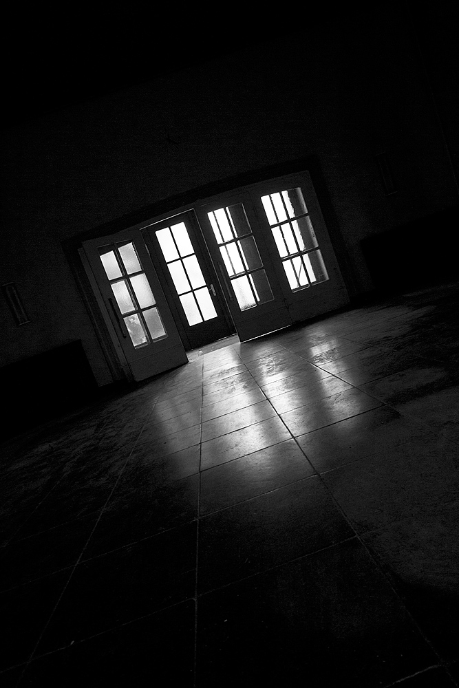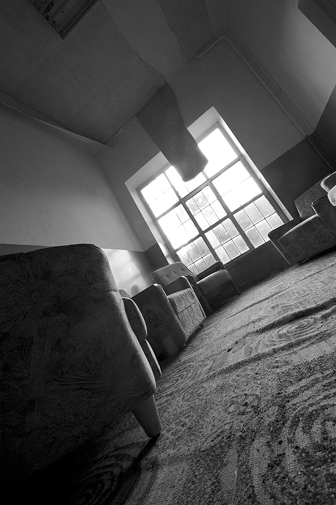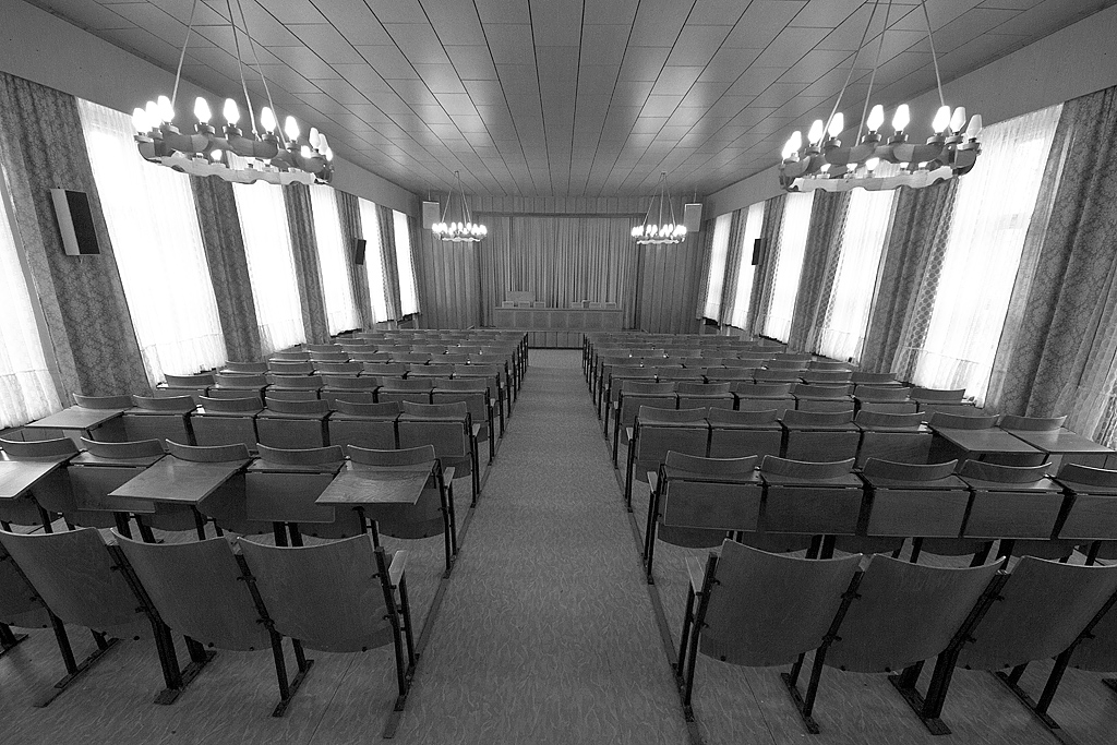 Am Ende des Gebäudes befindet sich ein Veranstaltungssaal. Zahlreiche Reihen mit Klappstühlen, sehr ordentlich und bestens erhalten. Die Bühne ist ebenfalls intakt. Ein altes Mikrophon scheint nur auf den nächsten Redner und entsprechende Zuhörer zu warten. Vier rustikale große Kronleuchter aus Holz passen gut zu den anderen Holzverkleidungen. Strom ist noch vorhanden und so spenden die Leuchter künstliches Licht. Gardinen und Vorhänge sind verstaubt, aber ansehnlich.