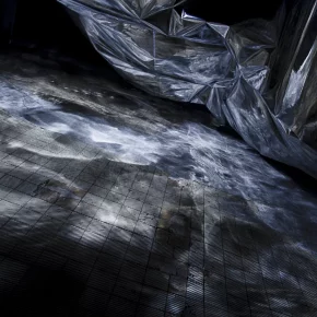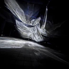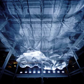 „Einder / Wind“ ist eine 30 Meter lange Installation, die eine bewegliche Struktur, dynamisches Licht und Raumklang in einem synchronen Stück vereint. Eine Reihe von Motoren und Ventilatoren versetzt ein großes Stück Stoff in eine nur bedingt kontrollierbare Kinetik. Die Parameter sind steuerbar, aber jede künstlich erzeugte Welle verhält sich anders. Durch Licht, Ton und Bewegung stellt die vertikale Fläche des Stoffs unterschiedliche Wetterbedingungen dar.